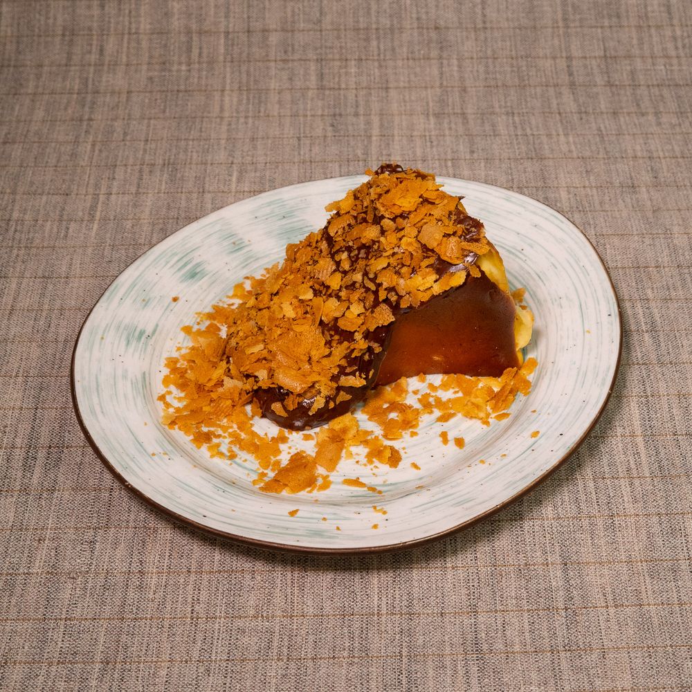 Нежный крем чиз, политый шоколадной глазурью и посыпанный вафельными хлопьями