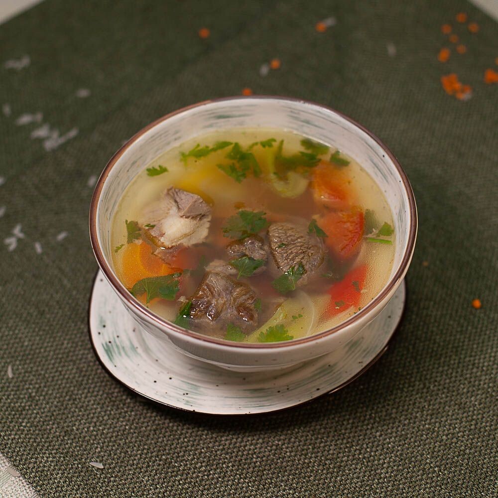 наваристый бульон с добавлением овощей (болгарский перец, помидор, морковь, картофель, зелень) и мясо баранины.