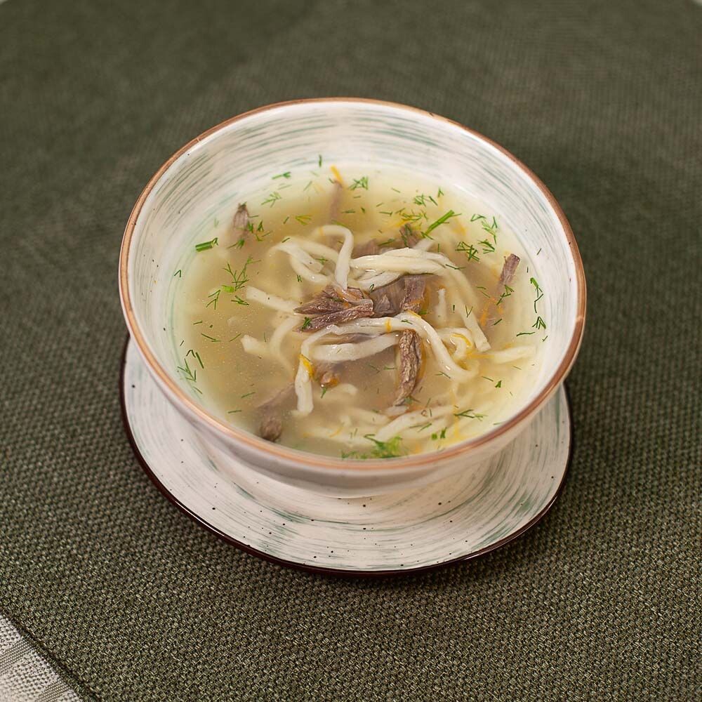 Традиционный казахский суп на мясном бульоне с добавление кусочки говядины , тонко раскатанного тесто (кеспе) и овощей(морковь, лук).