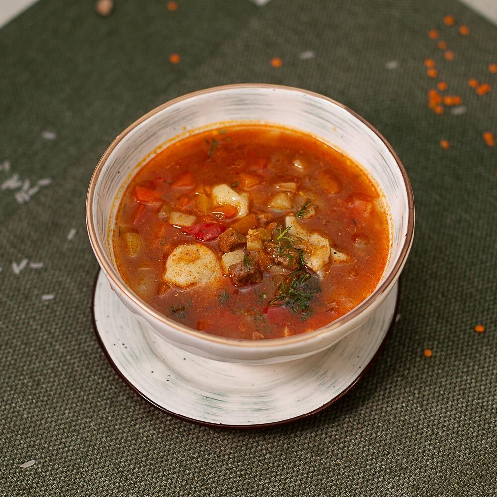 пельмени с наваристым бульоном с добавлением рубленной говядины и овощей (морковь, картофель, болгарский перец, лук, зелень) приготовленный по-узбекскому рецепту.