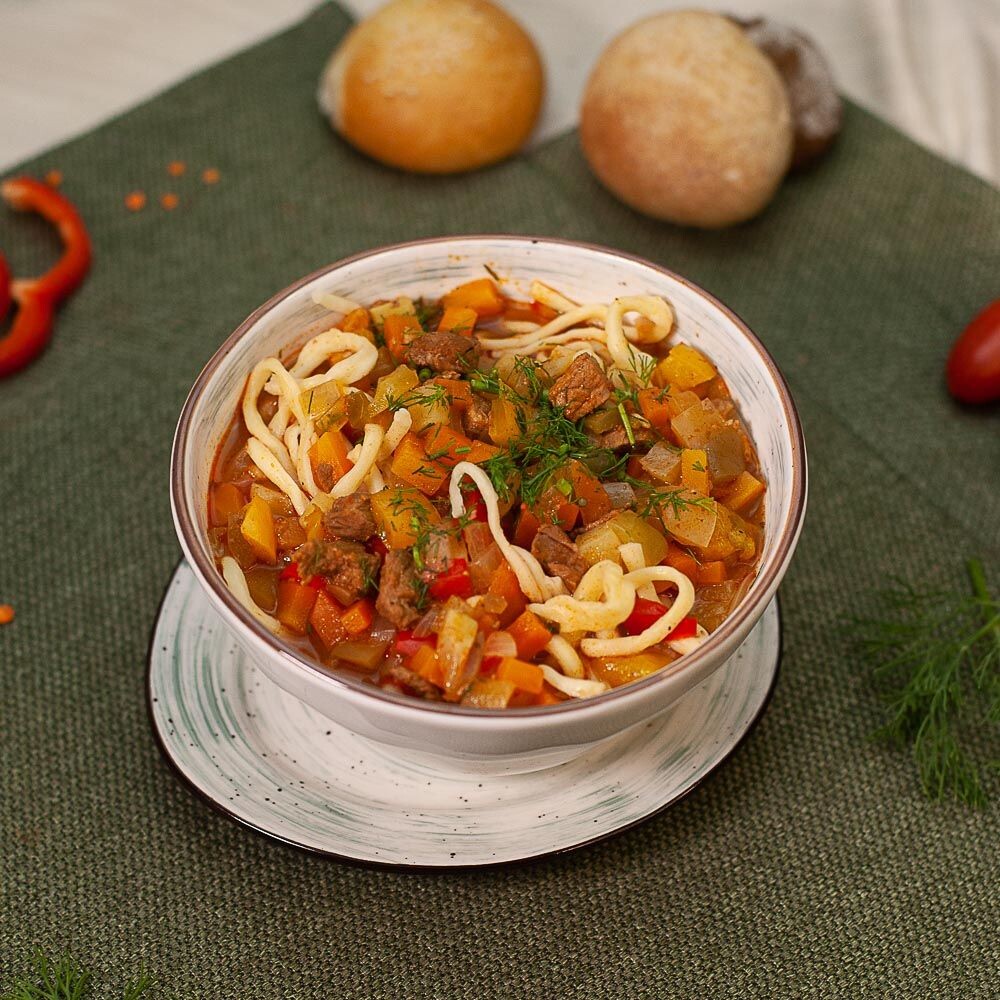 вручную тянутая лапша подается с наваристым бульоном с добавлением рубленной говядины и овощей (морковь, картофель, болгарский перец, лук, зелень)