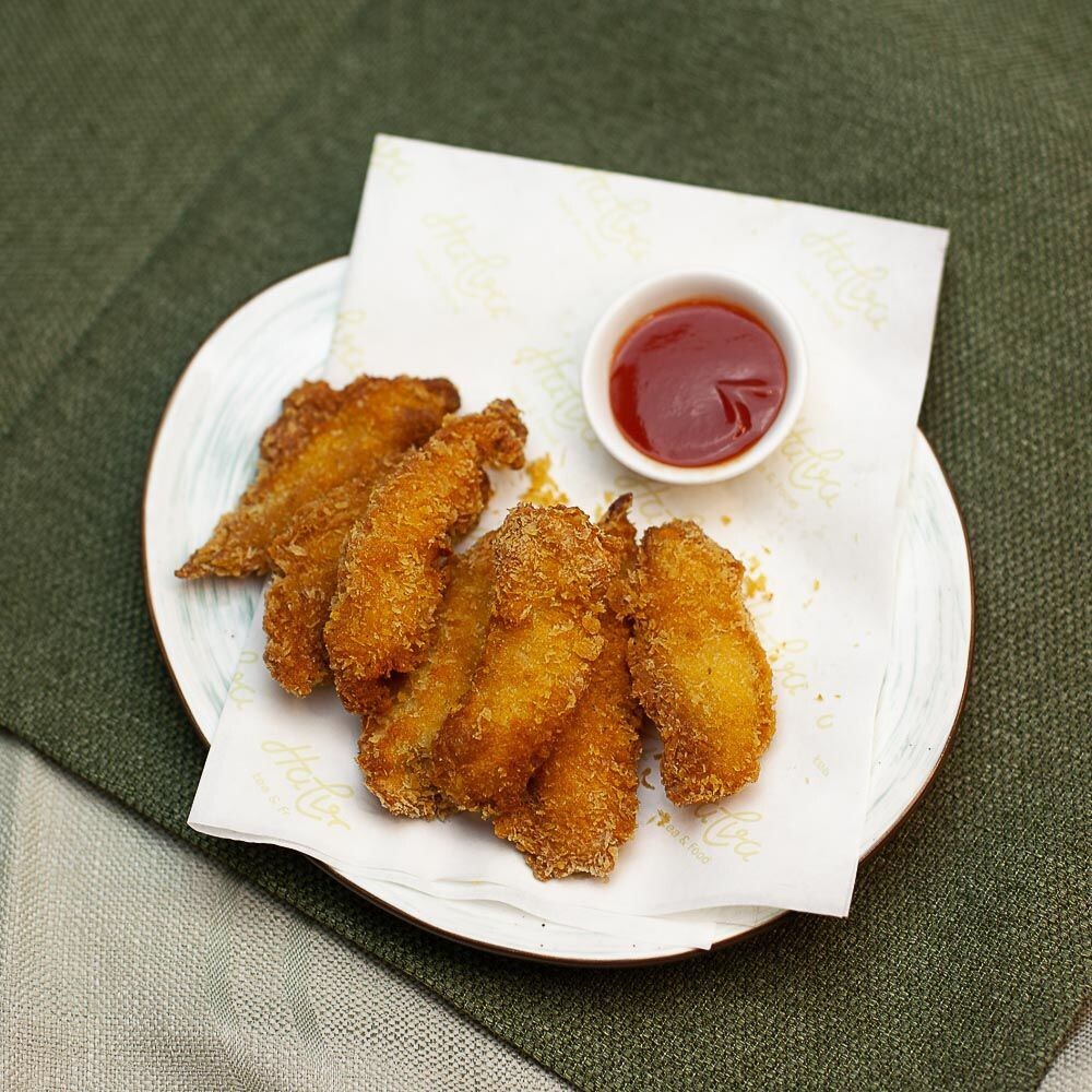 Кусочки филе курицы панированный в сухарях подается с кетчупом