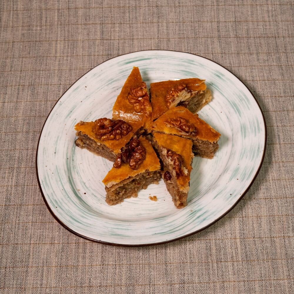 это восточная сладость который сделан из тонкого теста с начинкой из грецкого ореха и киш-миша и поливается медом что бы дополнить вкус десерта.