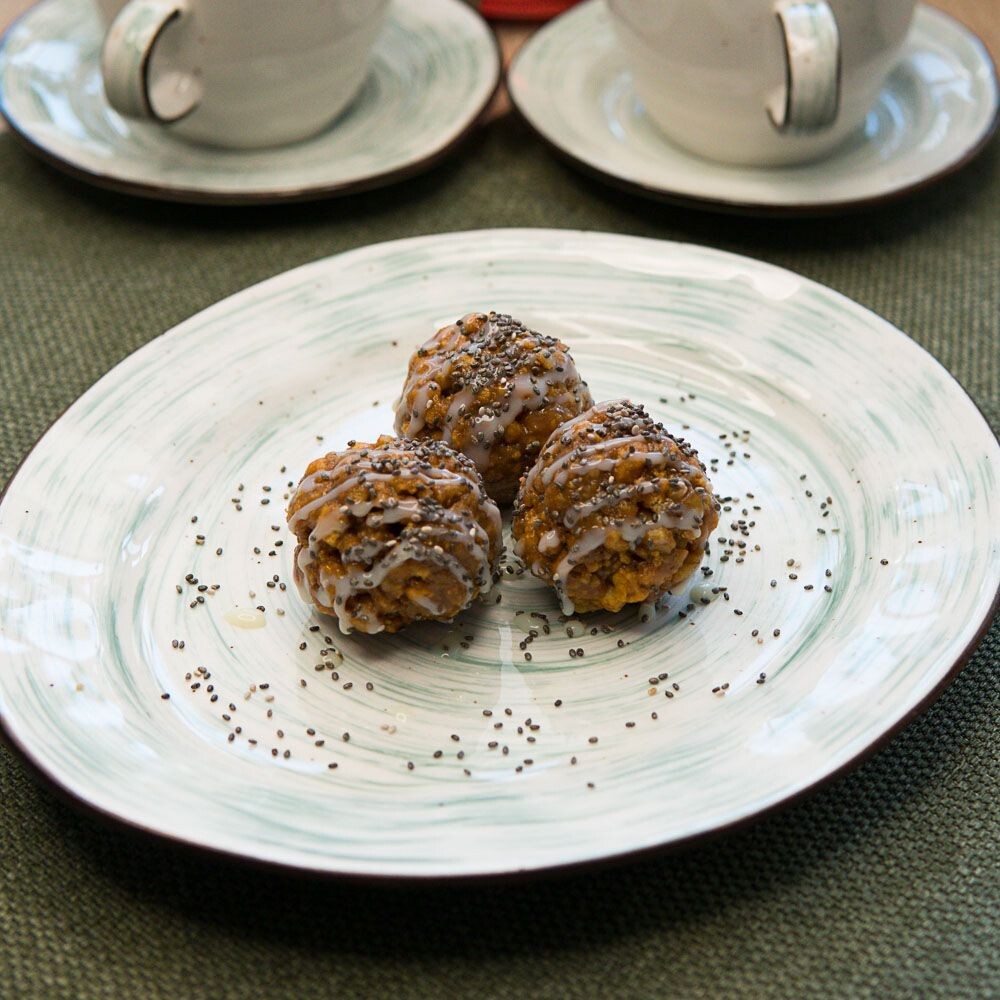 песочное тесто с добавлением грецких орехов и варенной сгущенки, посыпается семенами чиа.