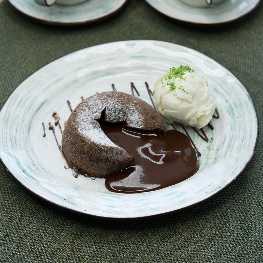 Популярный французский десерт, кекс из шоколадного бисквитного теста. Его особенностью является твердая хрустящая оболочка и жидкая сердцевина. Подается с мороженным.
